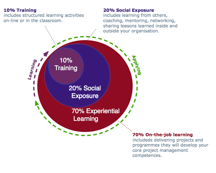 Before working in any self-development it is always worth setting your self a goal. This needed be a long-term life-changing mission, it can as simple as reflecting on where you are and where you would like to be in the short term. Is project management the right career for you and what sorts of projects do you like to get involves in. Is project management just part of your role or do you see project management as your future profession? It may be worth reading my other blog posts on is a career in project management right for me, as part of this review. If you decide professional project management is for you then you need to plan your next step. This is where the 70-20-10 model is useful in helping you to apply what you have learned.